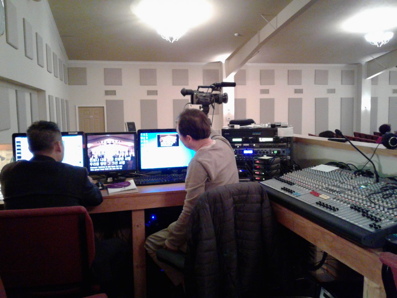 매주 예배중 방송실에서 음향과 조명, 스크린을 조정하고 있는 김광명 집사님, 김국진 집사님